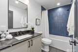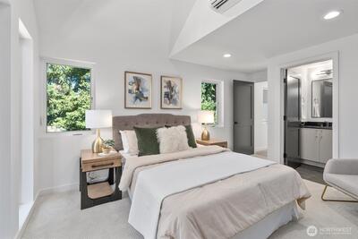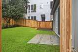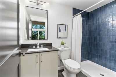 Sophisticated style meets everyday comfort in this newly built Northgate residence with its own private yard. The open-concept main level is anchored by a designer kitchen showcasing rich navy cabinetry, quartz counters, premium stainless steel appliances, and a striking tile backsplash. Expansive windows fill the living and dining areas with natural light and create a seamless connection to the outdoors. Upstairs, the serene primary suite offers a private balcony and spa-inspired bath, while a flexible second bedroom adapts to your needs. An expansive rooftop deck delivers sweeping treetop views, perfect for entertaining or relaxing. EV-ready off-street parking, efficient ductless heating/cooling, and close proximity to Northgate Station, neighborhood parks, shops, and dining make this home a standout.