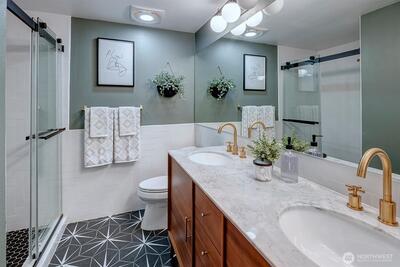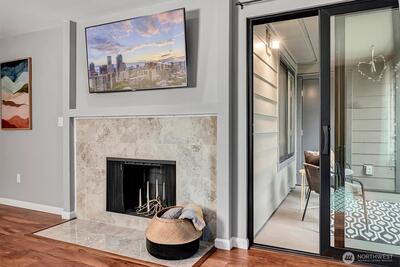 Welcome to Park Meridian. You'll love this turn-key, 2-bedroom, 1.75-bath condominium. Updates throughout, including new engineered hardwoods, remodeled bathrooms, new tile fireplace surround, updated kitchen and more. The 2022 building remodel included cement-board siding, new roof and new windows. Light and bright kitchen with a passthrough to the continuous dining and living rooms. Cozy wood-burning fireplace, picture windows which frame the outside greenery. Private deck for summer relaxation. Primary bedroom with ensuite bath. Custom heated tile flooring and tile surround, plus dual sinks with marble countertops. The second bedroom is roomy, and the 2nd bath includes a soaking tub, tile surround and new countertops. Park Meridian is pet friendly and there is no rental cap. 1 assigned carport parking spot plus ample guest parking. Great location, with proximity to the light rail, I5, 99, Northgate and the Kraken Iceplex. Nearby restaurants, shops and parks make this a great locati