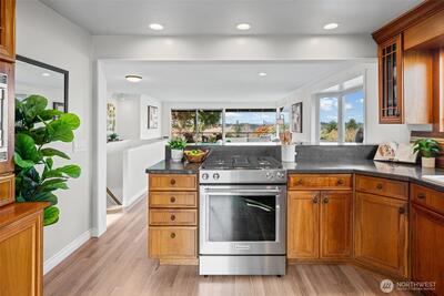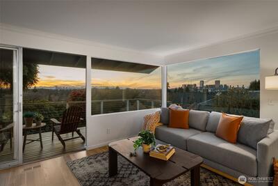 Perched on a quiet, and hard-to-find cul-de-sac at the westside crest of Bellevue’s highly sought-after Woodridge community, this beautifully updated home offers an open, light-filled layout designed for modern living. Newly refinished hardwood floors and fresh paint throughout create a crisp, move-in-ready feel, while expansive windows frame sweeping views of the Bellevue skyline, Seattle, and the Olympic Mountains. The spacious living area flows seamlessly to an elevated deck—perfect for relaxing or entertaining against a stunning natural backdrop. The kitchen connects effortlessly to a fully fenced backyard with patio space, ideal for outdoor dining, play, or pets. Versatile lower-level spaces provide room for work, play, or guests, adding flexibility to fit your lifestyle. Woodridge is known for its welcoming community and exceptional amenities, including two neighborhood pools, tennis courts, parks, and scenic trails. All just minutes to Downtown Bellevue, top-rated shop