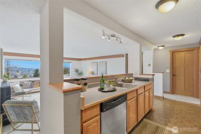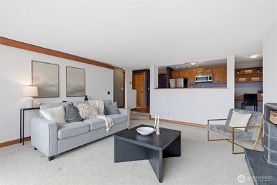 Spacious 2-bedroom, 1.75-bath condo in the well-established Quarterdeck community in Magnolia. The complex has undergone over $8M in major improvements, including new roof, siding, balconies, windows, and plumbing, offering peace of mind and long-term value. This light-filled home features an open floor plan with large east-facing picture windows showcasing views of the Ship Canal and Cascade Mountains. The kitchen with stainless steel appliances opens to a separate dining room with built-ins and flows into a sunken living room complete with a wood-burning fireplace and slate surround. Step out onto the private covered deck—ideal for year-round enjoyment and views.The primary suite includes a sunken tub, and additional features include in-unit washer/dryer, extra storage, and assigned covered parking. Residents enjoy access to a heated outdoor pool, sauna, gym, BBQ patio overlooking the pool, clubhouse lounge/kitchen, secure entry, and on-site manager. Conveniently located just minut