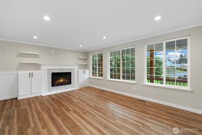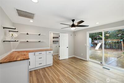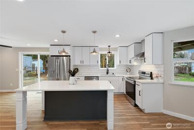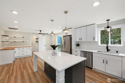 Beautifully remodeled and well designed 3 bedroom 2.5 bath in a wonderful cul-de-sac ideally located within the Puyallup school district. Thoughtfully updated throughout with new high end flooring, fresh new carpet, accent lighting adding warmth and style enhancing the home’s inviting atmosphere. The home features the remodeled kitchen having elegant quartz countertops, large added Island, a unique custom Butcher Block prep area with more cabinets, pantry, all complementing the modern finishes. The bathrooms have been upgraded with, newer vanities, sinks, faucets, flooring, and toilets. Primary shower was recently tiled. Newer roof and water heater, providing peace of mind for years to come. The home’s appeal shines with a reinvented front porch and nicely landscaped front yard that creates a welcoming feel. Out back, a large deck offers the perfect space for entertaining, while the large lot provides ample room for outdoor enjoyment. The play set center for children remains. In a