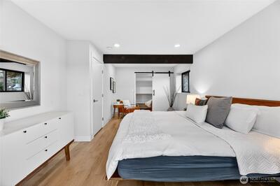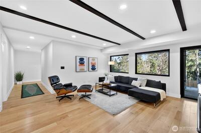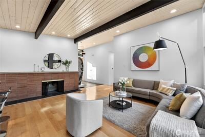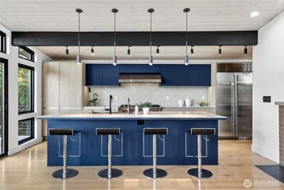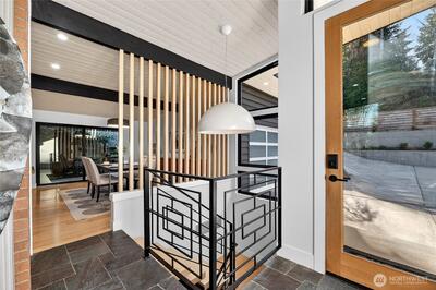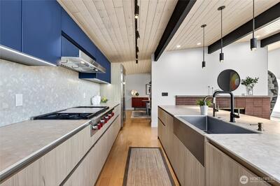 Mid-Century Modern reimagined! This Woodridge home was taken down to the studs in 2021 & rebuilt, preserving the original design while introducing modern, high-quality finishes. The open-concept main floor features a chef’s kitchen beautifully appointed with Leicht German cabinetry, Caesarstone counters, Sub-Zero fridge, Wolf range, Miele DW & Dacor double oven, plus an eat-in bar for casual dining. The upper deck extends the living space outdoors-perfect for dining & relaxing while taking in easterly territorial views. A separate, spacious dining area is flanked by an original braai (grill) & offers access to a side patio & insulated 2-car garage w/ EV-ready power. 5 beds & 4 baths across 3,020 SF offer exceptional flexibility, including 3 bedrooms on the main floor, & 2 ensuite bedrooms—ideal for guests or multi-gen living. The spacious primary suite includes a walk-in closet & a spa-like 5-piece bath featuring an incredible soaking tub. The lower level is designed for both relax