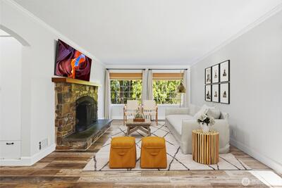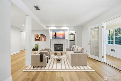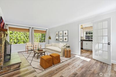 Charming bungalow on an oversized lot with exciting subdividing potential! This light-filled home welcomes you with beautiful hardwood floors and an inviting living room anchored by a cozy fireplace. The updated kitchen features a convenient eat-in area, perfect for everyday dining, while the refreshed main bath adds a touch of modern comfort. Downstairs, a spacious rec room with a half bath offers flexible space for entertaining, hobbies, or a home office. The primary suite includes an attached bath and walk-in closet, ready for your personal finishing touches. Step outside to enjoy expansive gardens and a charming front deck, ideal for relaxing or hosting gatherings. The generous lot offers endless possibilities for outdoor living, gardening, or future investment. Conveniently located near shopping, dining, and major highways, and within the highly regarded Issaquah School District, this home combines comfort, opportunity, and accessibility.