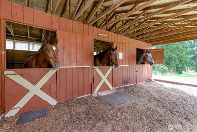 Spacious split-level on 2.4ac, provides significantly more living space than reflected in County records (buyer to verify) due to lower level being completed & sunroom add. Main level features bright living rm w/custom brick fireplace & wood stove insert, creating a warm, inviting gathering space. Primary bed includes ¾ bath. Fully enclosed sunroom expands living area & offers year-round enjoyment of peaceful pasture views. Lower level features a large family rm perfect for entertaining, TV, or gaming, plus wood stove insert. Also includes additional bonus room not counted as a bedrm by county, ¾ bath, flex space w/ laundry plus room for home office, gym, etc and a generous storage/pantry room. Attached 2-car garage has room for work benches, projects & more. Outside, the property shines w/covered patio perfect for BBQs & entertaining. Enjoy enclosed “clubhouse” outbuilding—ideal for gatherings, hobbies, home theater, or gym. Acreage is all set for horses & animals, w/stables,