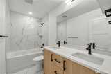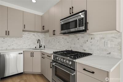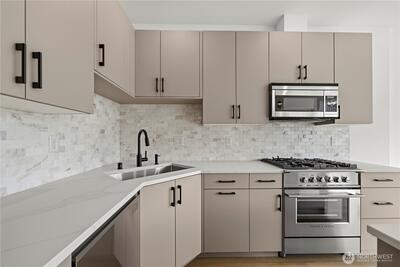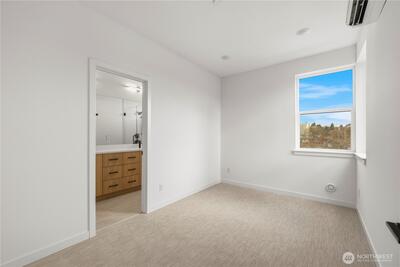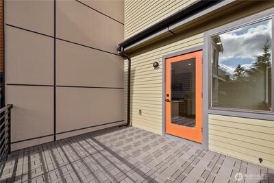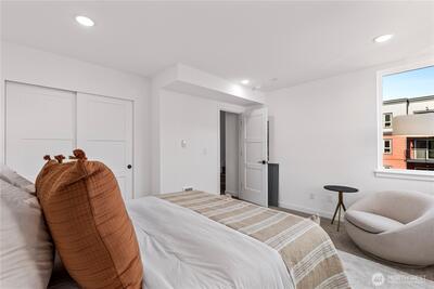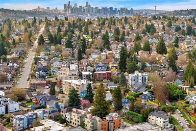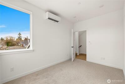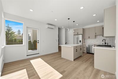 The Reserve II by MRN Homes — a rare opportunity just 1.5 blocks from Green Lake tucked along a serene residential street with covered EV-ready parking included! One of only two homes, where the main living space opens directly to a private deck—creating seamless indoor-outdoor living. Inside, clean modern design meets thoughtful craftsmanship: Fisher & Paykel appliances, gas range, kitchen island w/eating bar, quartz countertops & locally crafted custom cabinetry, all anchored by light-filled living spaces. Mini-split heating & A/C for efficient year-round comfort. Upstairs, the primary suite offers a spa-inspired bath + walk-in closet, while a spacious second bedroom flexes easily for guests or a work-from-home setup. Above it all, a rooftop deck with gas, water, and power—ready for entertaining, dining, or unwinding with sunset views. Moments to Green Lake, trails, PCC, cafés, UW, and Roosevelt Light Rail. This is one of the few opportunities to own new construction in prime