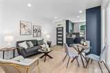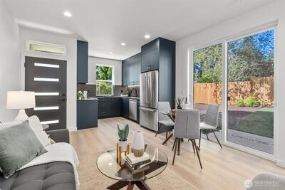 Sophisticated style meets everyday comfort in this newly built Northgate residence with its own private yard. The open-concept main level is anchored by a designer kitchen showcasing rich navy cabinetry, quartz counters, premium stainless steel appliances, and a striking tile backsplash. Expansive windows fill the living and dining areas with natural light and create a seamless connection to the outdoors. Upstairs, the serene primary suite offers a private balcony and spa-inspired bath, while a flexible second bedroom adapts to your needs. An expansive rooftop deck delivers sweeping treetop views, perfect for entertaining or relaxing. EV-ready off-street parking, efficient ductless heating/cooling, and close proximity to Northgate Station, neighborhood parks, shops, and dining make this home a standout.