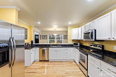 Tucked into the highly sought-after Snoqualmie Ridge community, this thoughtfully designed Quadrant built "Cottage Design" offers a rare blend of charm, privacy, and everyday functionality. Meticulously maintained by its owner, the home reflects true pride of ownership at every turn. Backing to a serene forested greenbelt, the home provides a peaceful setting with a beautifully curated courtyard and indigenous landscaping that comes alive with seasonal blooms throughout the year. A raised bed garden and fenced, private patio create a peaceful outdoor setting, seamlessly extending the living space. Inside, rich hickory floors and remodeled fireplace with updated stonework anchor the main level, complementing the home’s warm and inviting layout. The open-concept design allows for seamless flow between the kitchen, dining, and living areas, ideal for both everyday living and entertaining. Large windows invite in natural light while framing the tranquil greenbelt backdrop. The ov