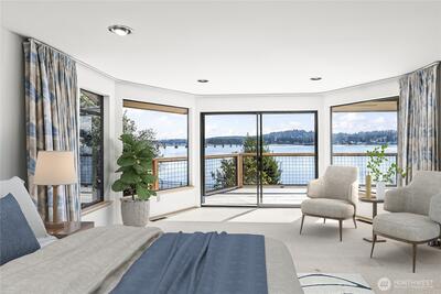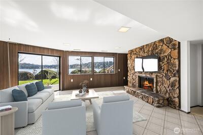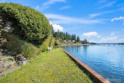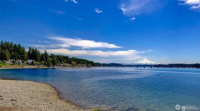 Sensational southern exposure, no bank waterfront legacy property awaits on iconic Warren Drive! Never before brought to market, this residence on over half an acre offers 90' of the most sought after shoreline in the coveted Gig Harbor community. 180 degree views from over 4200 sq ft span breathtaking Mt. Rainier to the east and striking sunsets to the west, all the while with easy access to the soft pebble beach and the beauty of Hale Passage and Fox island as the stunning setting. Take in Orcas, eagles, boaters and glistening sunshine on the water daily here from this perfectly laid out home, complete with large water facing entertaining deck, soaring ceilings with wood beams and an open style concept. The large ensuite primary retreat is main level with deck access as well as the second bedroom which is also generously sized and full of natural light. Graced by a dual sided fireplace the kitchen and living room are bright and carry the awe inspiring floor to ceiling, ever beautif
