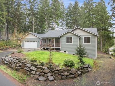 Stunning single-level home in the sought-after Alderbrook community! This 2 bed + large office, 1.75 bath home offers 1,613 sq ft of open-concept living with vaulted ceilings and pride of ownership throughout! The well-appointed kitchen features quartz countertops, stainless steel appliances, and flows seamlessly into the spacious dining and living areas - perfect for entertaining. The primary suite includes a custom shower and walk-in closet. Situated on nearly a 1/3-acre corner lot just off the 12th fairway, enjoy peaceful, treed privacy and a large back deck for outdoor living. 2-Car Garage & usable crawlspace for storage. Ample amount of parking too! Alderbrook offers an unmatched lifestyle with golf (green fees included in HOA dues), tennis, pickleball, clubhouse amenities, dining, fitness, trails, and access to Hood Canal. Experience the perfect blend of comfort, recreation, and community! Welcome Home!