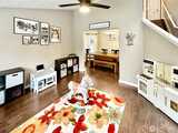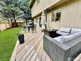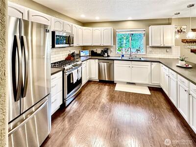 Lovely west Olympia home offers 4 bedrooms, 2.5 baths in a private setting abutting green belt. Wonderful design with bay windows in living and dining rooms, entry and living room with vaulted ceilings & skylight. Rich, laminate hardwood flooring throughout home as well as updated painted trim package, no carpets here. Ample dining room between living and kitchen with room for large table. Lovely kitchen features subway tile backsplash, newer counter tops and high-end stainless appliances including gas range. Lots of cabinets and pantry for storage. Kitchen is open to family room with gas fireplace; a wonderful place to prepare meals. Slider leads to newer Trex deck and fully fenced rear yard with firepit. Serene natural views surround rear and side yards offering privacy. All baths have been updated with new flooring and stylish vanities, laundry room offers cabinets, washer and dry included. Large primary with walk-in closet and luxury bath with soaking tub and separate shower.