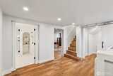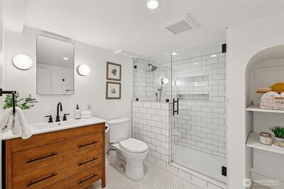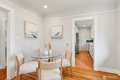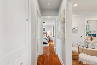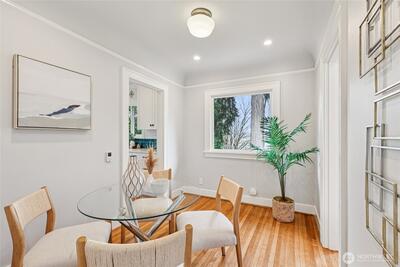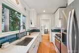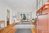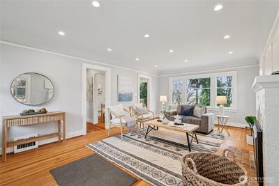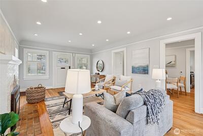 Perched along a tranquil green belt, this Craftsman bungalow blends timeless character with thoughtful modern updates. Enjoy sweeping views of the Olympic Mountains and glimpses of Seattle’s stadiums, all while being just minutes from the vibrant dining scene of Beacon Hill, plus convenient light rail and bus connections with quick access to I-5 and I-90. Inside, original charm shines through coved ceilings, picture rail molding, rich hardwood floors, and classic windows, complemented by a cozy gas fireplace. The fully updated kitchen features new countertops, custom hardwood cabinetry, and upgraded appliances. The remodeled daylight basement offers a private retreat with a spacious suite, walk-in closet, and a beautifully renovated bathroom with a walk-in shower. Recent 2025 upgrades include a new composite roof with warranty, new gutters, fresh exterior paint, and reconstructed entry pillars. Modern systems such as a tankless gas water heater, forced-air heat pump with AC, updated