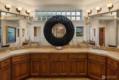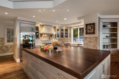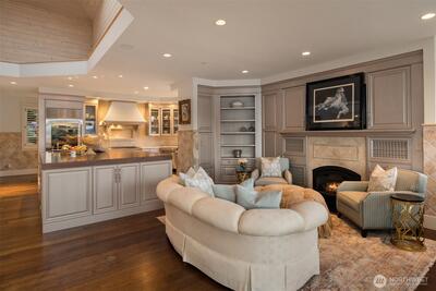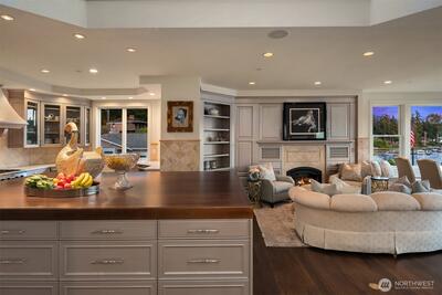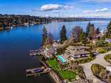 Private one-of-a-kind waterfront estate! A gated drive leads to this stunning waterfront retreat sited on 75 ft of sunny southwestern Lake Washington waterfront. This grand home offers unlimited possibilities for a tailor made lifestyle. From poolside lounging to lakeside living. Bask in commanding Mt. Rainier views and dazzling sunsets as you watch the water craft on Lake Washington's East Channel. A substantial dock has a protected slip and lift along with plenty of space for all of your water toys. Step into the two story entry where stunning black and white marble floors are a WOW as you enter while creating an air of urbane sophistication. Skylights above bathe the main floor in natural light. Generous day rooms open to the outside. The reimagined chef’s kitchen will thrill even the most discerning and boasts the latest “must have” for serious cooks, a separate prep kitchen. A main floor study tucked behind the kitchen offers a quiet place for work or homework. Built with a