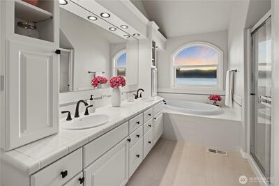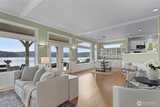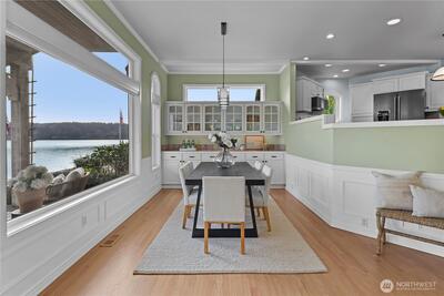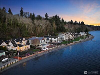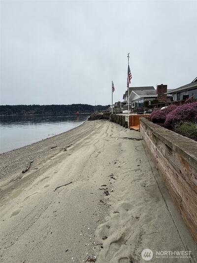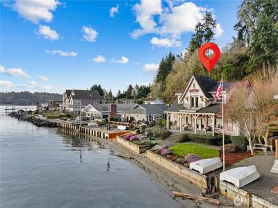 Set along Puget Sound, this low-bank waterfront home offers 62 feet of privately owned tidelands with northeast-facing orientation capturing morning light across the water. Expansive, unobstructed views stretch across Colvos Passage to Vashon Island, creating a wide-open waterfront outlook with an active marine backdrop of passing boats and changing tides. An existing bulkhead provides defined shoreline and walk-out beach access. Custom built in 1996 by its only owner, this property presents a rare opportunity along Colvos Passage. Interior spaces are oriented to the shoreline with a seamless indoor-outdoor connection. The gourmet kitchen opens to the dining and great room, making entertaining flow. A main level bedroom functions as a den/office or guest room with built-in Murphy bed. The great room is anchored by a fireplace and walls of windows framing the water. Upper-level primary suite spans the entire floor with water views, private balcony, five-piece bath with soaking tub posi