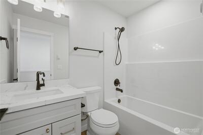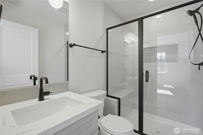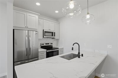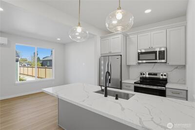 New construction home in a thoughtfully designed 3-residence community in North Tacoma, offering a detached-home feel with low-maintenance ownership. This home is independently framed with its own structural wall system, separated from the adjacent residence by a 2-hour fire-rated wall assembly. Unlike typical attached construction, each unit maintains its own wall structure, providing enhanced sound control and separation. See supplementals for details. The layout is efficient and well-balanced, with clean finishes, strong natural light, and a functional flow between living, kitchen, and outdoor space. The kitchen features quartz countertops, stainless steel appliances, and modern cabinetry, creating a clean, durable, and easy-to-maintain space. The exterior includes defined pathways and a private outdoor area that is individually assigned to the home. The space provides separation and usability for outdoor living. 1 dedicated off-street parking space is located via the al
