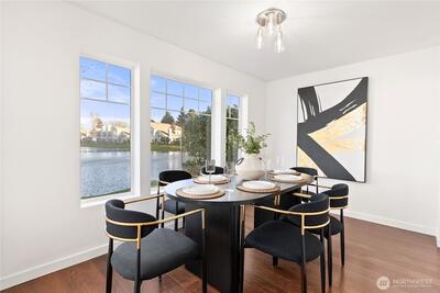 Once-in-a-lifetime opportunity to own the most unique corner unit in the community—truly one of one. No other unit offers this level of exposure, surrounded by and facing the lake from nearly every angle, delivering unmatched privacy, peace & serenity. Lives like a house w/ a functional 2-story layout, attached 2-car garage + driveway parking. Step inside to tall ceilings, an airy, open layout & hardwood floors throughout the main level. Beautifully updated kitchen w/ quartz counters, new shaker cabinets, SS appliances & stylish backsplash. Dining + nook wrapped in windows, perfectly framing the lake. Half bath + laundry on main for convenience. Upstairs offers 3 generous bedrooms, including a stunning primary retreat filled w/ lake views, walk-in closet & spacious en-suite. Bathrooms feature designer tile, new vanities & fixtures. Step outside to a spacious patio + Trex deck—perfect for relaxing, watching ducks & soaking in the views. Minutes to restaurants, Kent Ice Arena, Green