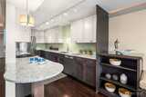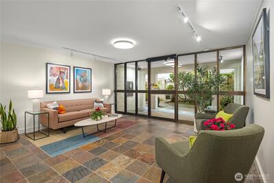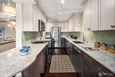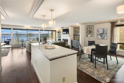 Welcome to this beautifully renovated, newly painted corner unit, offering one-level living with stunning views of Lake Washington and the Cascade Mountains. The spacious interior features a light-filled living room with floor-to-ceiling windows, a cozy fireplace, high-end lighting, and custom millwork throughout, creating an inviting space, perfect for dining and entertaining. The modern chef's kitchen boasts quartz countertops, stainless steel appliances, stylish backsplash, and is complemented by a unique built-in bar that overlooks the expansive views. The deck has plenty of room for outdoor dining or relaxing! Enjoy access to a secure building with an elevator, executive gym, sauna, woodshop, electric car charger, and a large storage locker. The property has an outdoor pool with a fountain and quick access to the Burke Gilman Trail, Warren Magnuson Park, Sandpoint Country Club, restaurants, shopping, groceries, multiple world-class hospitals, and easy downtown access. A great oppo