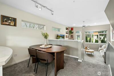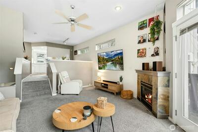 Tucked away in a quiet North Seattle setting, this townhouse-style end unit lives like a single-family home — offering privacy, space, and the kind of versatile layout that's rare in condo living. Spread across three levels, this 2-bed, 2.5-bath plus potential 3rd bed gem delivers 1,216 sq ft of thoughtfully designed space ideal for hosting gatherings and welcoming guests. The main level flows seamlessly from a cozy gas fireplace living room to a dedicated dining area and a well-equipped kitchen with gas cooking. Step outside to enjoy territorial views from your private fenced deck and yard — a true urban retreat. Upstairs, two generously sized bedrooms each feature their own en-suite bath, with bedroom floor hallway in-unit washer/dryer for added convenience. The entry level offers a finished bonus room perfect as a home office, gym, or convert to conforming third bedroom — plus an attached garage with extra storage plus a second, dedicated uncovered parking space. Pets welcome