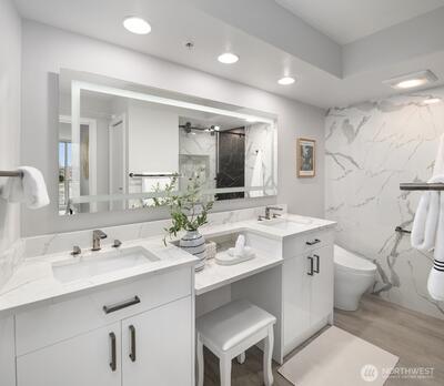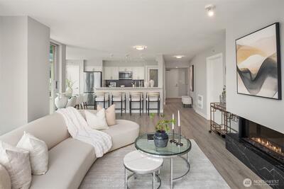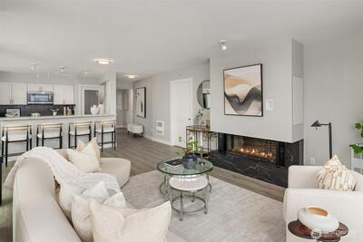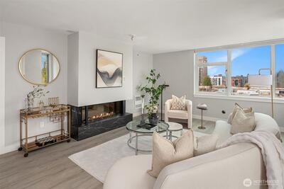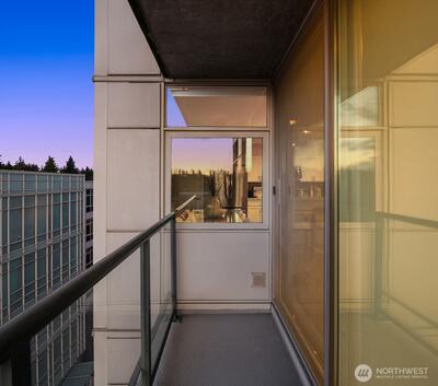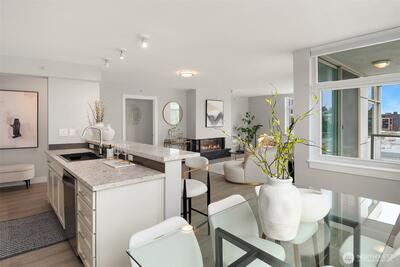 [Luxury Downtown Bellevue Living] Experience refined corner-unit living at The Palazzo, where sunset views and an unbeatable location come together. This beautifully updated 2-bedroom, 1.75-bath (2 parking spots - 2 balconies) residence offers a light-filled, open layout with expansive windows and a spacious living area anchored by a cozy fireplace. Designed for both comfort and lifestyle, the home features two private balconies—one off the living area and breakfast nook with west-facing sunset and northern territorial views, and a second off the primary suite, perfect for unwinding at the end of the day. The kitchen is equipped with stainless steel appliances, granite countertops, and a breakfast bar, seamlessly connecting to the dining space and living room. Don't forget the brand new automatic blinds throughout the home. The primary bedroom is a true retreat, showcasing a wall of windows, city views, balcony access, and a fully renovated ensuite bath, while the second bathro