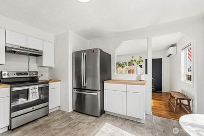 Want to live in the heart of Puyallup? This adorable and affordable 2-bedroom, 1-bath home offers charm, comfort, and thoughtful updates throughout. The home features a brand-new kitchen with new appliances, fresh interior paint, and modern updates that make it truly move-in ready. New butcher clock counter tops and cabinets. Stay comfortable year-round with an efficient heat pump providing both heating and cooling, plus enjoy the warmth and character of a cozy wood-burning stove during cooler months. The shed includes seasoned firewood ready to use, adding extra convenience. Outside, the fully fenced yard with alley access provides privacy and flexibility, complete with a detached single-car garage, two additional outbuildings for storage or hobbies, and a small patio area perfect for relaxing or entertaining. One shed has electricity and is ready to be used as an extra living space or for crafts, office, so many options to choose from! Located close to shopping, schools, tons of dini