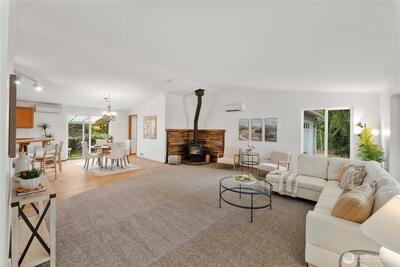 Enjoy privacy at this, 4-bed, 2 full bath, 2,112 SF rambler on 1.25 acres w/ a 24 X 28' detached shop! Vaulted living room includes a woodstove w/ tile surround. Huge open concept & vaulted kitchen-living area w/ bar height seating & adjacent eating area. Primary bedroom w/ walk-in closet & full, 5pc, primary bathroom w/ soaking tub. Good sized guest bedrooms. Full guest bath w/ dual vanity sinks. Big laundry room + mud room at the garage entrance. Heat pump/mini-split system w/ units in the kitchen, living, primary and in the 500+SF, 2-car attached garage (yes heat & AC in the garage!). Shop is set up perfectly for any project or storage needs w/ 2 bays, concrete floor & 125A power. Huge lot w/ RV/extra parking, woodshed + garden shed, fire pit entertaining area, apple + cherry trees and covered back patio. New roof in 2022 + Gutter Helmet gutter covers. New carpet & fresh interior paint in 2026. Private well. Wired for generator. Come see this one quick because it won't last!