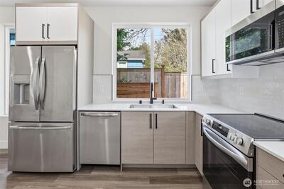 Nestled on a peaceful, tree-lined block in the heart of Mount Baker, this cottage offers a fresh take on comfortable city living. The main level welcomes you with a bright, open layout and a well-appointed kitchen featuring quartz countertops, stainless-steel appliances, custom cabinetry, and a roomy pantry—designed for both everyday ease and casual gatherings. Upstairs, two inviting bedrooms with vaulted ceilings fill with natural light, creating a relaxed retreat alongside a beautifully finished, spa-style bathroom. Dedicated parking provides rare convenience, while the surrounding neighborhood places you close to Mount Baker’s parks, cozy cafés, and beloved local spots. With thoughtful design, modern finishes, and a location rooted in one of Seattle’s most established neighborhoods, this home delivers a unique opportunity to enjoy new construction with true neighborhood character.