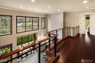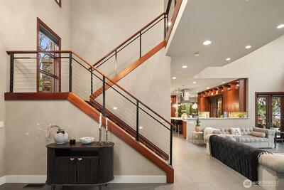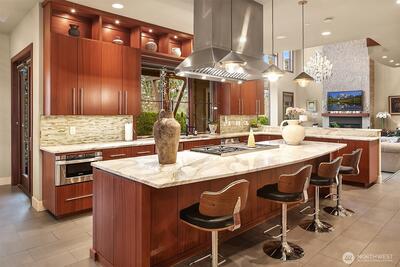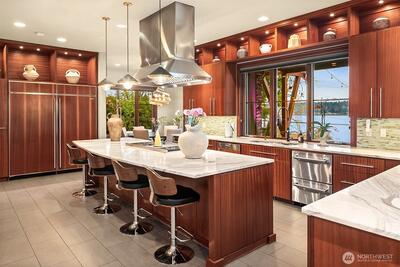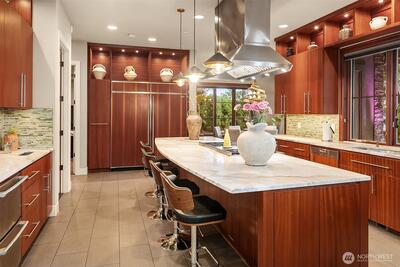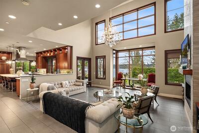 Experience timeless elegance and refined living in this pristine custom estate overlooking the shimmering waters of Lake Sammamish. Set on over 2 private, lush acres, this stately residence is a masterclass in architectural design—where luxury, scale, and serenity converge. From the moment you enter, soaring ceilings and dramatic walls of windows bathe the home in natural light, perfectly framing tranquil lake and territorial views. Rich bamboo flooring flows throughout the main living spaces, complementing exquisite marble surfaces, including a stunning floor-to-ceiling marble fireplace that anchors the grand living area. Crystal chandeliers add a touch of sophistication and brilliance throughout. The chef’s kitchen is both functional and striking, featuring premium appliances including a Sub-Zero refrigerator and freezer, a Wolf oven, custom Sapele cabinetry, and elegant marble countertops—ideal for both intimate gatherings and grand entertaining. Thoughtful details such
