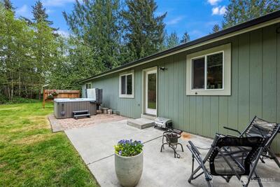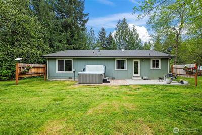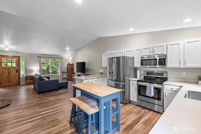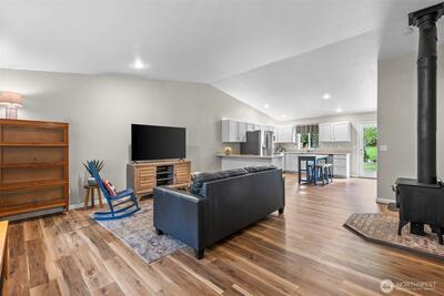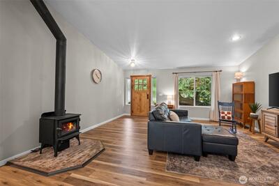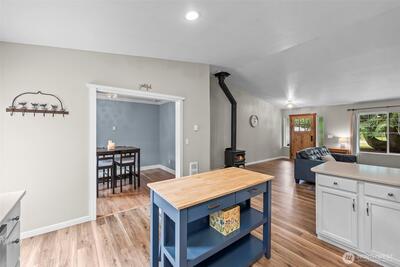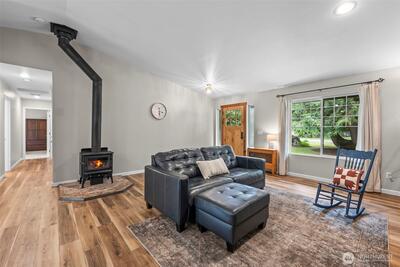 Cute as a button! This 1216 sqft rambler is turn key with room to roam on 1.3 acres! Many thoughtful updates in the last few years provide peace of mind and low maintenance home ownership! You'll love the gorgeous details like the Knotty Alder front door, the decorative light fixtures and dimmable switches. Plus the more practical updates in the last 5 years include a new roof, gutters, hot water tank, LVP flooring & carpet and Starlink that stays! When you enter the home, you're greeted by vaulted ceilings and a cozy wood stove in the living room that opens to the kitchen with this great room concept. The stainless steel appliances are like new. You'll appreciate the butcher block island and breakfast bar seating. The dining room used to be a third bedroom and could easily be converted back to a bedroom. The other 2 bedrooms are located down the hallway, with a full bath in the hall and a full ensuite off the primary bedroom, along with a walk-in closet. The hot tub is clean and read