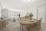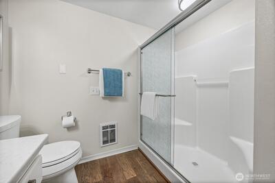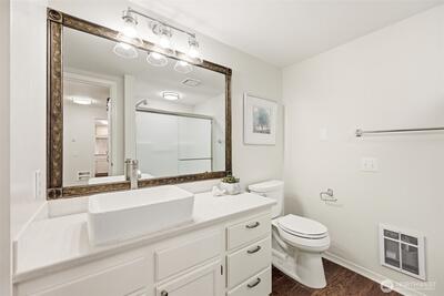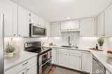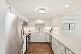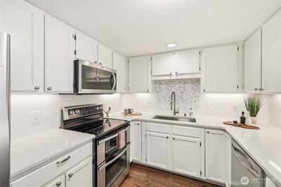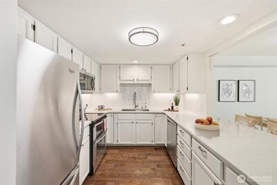 Beautifully updated and meticulously maintained move-in ready home in desirable Providence Point! This light-filled home offers comfort, style, and easy living. Attractive kitchen with engineered hardwood flooring, stainless steel appliances, quartz countertops, subway tile backsplash, under-cabinet lighting, and a breakfast bar, perfect for everyday living and entertaining. Open floor plan with newer vinyl windows with sunshades, updated lighting, and abundant natural light throughout. Primary bedroom features custom closets. Updated bath with engineered hardwood flooring, quartz vanity, vessel sink, and a newer glass-enclosed easy-access step-in shower. Front-load washer and dryer tucked behind a stylish barn door. Private covered deck with sunshade overlooking a quiet, peaceful community patio, ideal for relaxing mornings or evening unwinding. Featuring new carpet and fresh interior wall paint. Storage closet located in the common hall. 1-car common garage with on-street parking for