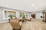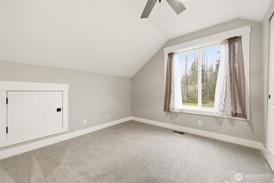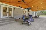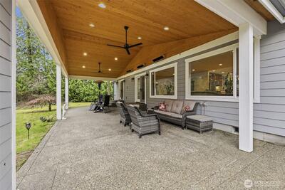 Tucked away on 4+ private acres in Graham, this custom-built home blends comfort, versatility, and thoughtful design. The main level offers 4 bedrooms and 3 baths, plus a well-appointed kitchen with cherrywood cabinetry, granite countertops, under-cabinet lighting, and a built-in bench with storage in the dining area. The spacious primary suite features a large walk-in closet and a luxurious ensuite with heated floors, soaking tub, and separate shower with waterfall heads. Upstairs provides flexible living with an additional bedroom, bonus room, full bath, full kitchen, and second utility room with washer/dryer hookups—ideal for multi-generational living or guests. Enjoy year-round outdoor living with a covered entertaining area featuring 3 infrared heaters, ceiling fans, TV hookup, and surround sound wiring. Additional highlights include motorized blinds throughout, intercom and security system accessible via any TV, a 3-year-old metal roof and furnace, new water heater, whole-home