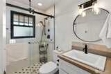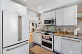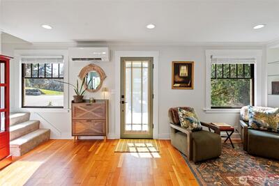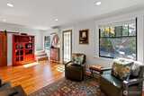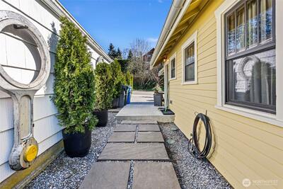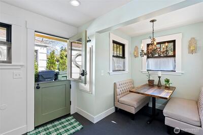 Vintage 1932 cottage bungalow is a tiny treasure, yet big on charm, inside and out. Meticulously restored in historic downtown Steilacoom, this home offers timeless design with modern systems, blending the best of both eras. Step inside to a cozy living room with gas fireplace, built-in glass shelving, & refurbished original Douglas fir flooring. The main level includes a primary bedroom & fully remodeled bathroom with tile flooring, updated fixtures, & glass shower. A chef's delight, the kitchen is a standout, featuring high-end GE Cafe' appliances, quartz countertops, custom cabinetry with vintage hardware, Moroccan tile backsplash, & Marmoleum flooring. Enjoy meals in the quaint breakfast nook with old-school chandelier & natural light entering through new Andersen windows. A Dutch door, open fir shelving, & under-cabinet lighting enhance this lovely gathering space. Conveniently located on the main level & tucked behind a custom barn door is a GE washer/dryer combo. Upstairs, two b
