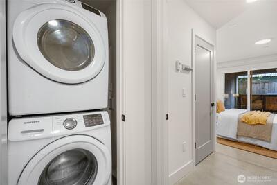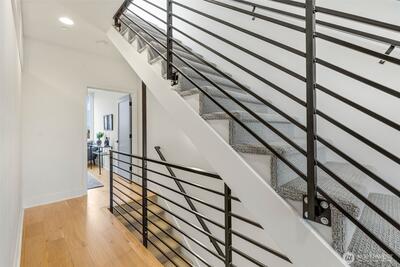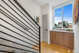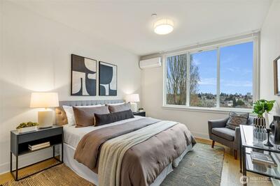 Awesome location just steps from Green Lake and directly on the E Line, this 2020 rowhome offers effortless access to Downtown Seattle and beyond. Thoughtfully designed with a central entry, the home features a highly functional layout that minimizes stairs and maximizes everyday livability. Oriented to the east, enjoy a sweeping birds-eye perspective across the Wallingford valley, with serene views of trees and distant mountains. Inside, you’ll find three spacious bedrooms -each finished with hardwood or polished concrete floors - along with soaring ceilings and dramatic double height windows that flood the home with natural light. The main living area has high ceilings and lots of light plus a seamlessly connected kitchen, dining space, and living room; perfect for entertaining or relaxing in style. On the top a private rooftop deck where you’ll take in peaceful views and enjoy a private outdoor retreat. The lower-level bedroom offers polished concrete floors and direct access to