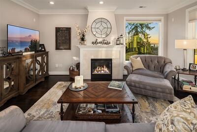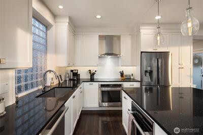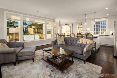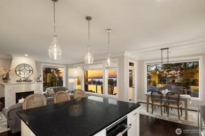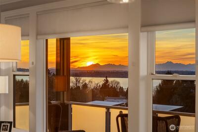 Dreamy sunsets sparkle off the lake from this top floor Houghton condo. Warm and inviting finishes draw you in to a sunlit great room. The family room with gas fireplace, dining room and beautifully appointed chef's kitchen all enjoy large picture windows that flood the interior with natural light. Spacious view deck for grilling or relaxing. Luxurious primary with a large walk-in closet and ensuite 5-piece bath featuring freestanding tub and tile shower surround with frameless glass. Second bedroom with walk-in closet and adjacent full bath. Spacious utility room includes full size washer & dryer, linen closet & hanging storage. Newer, efficient hydronic heat pump system & central A/C. Tandem garage with parking for 2, plus massive storage room. Quick and easy freeway access and convenient nearby transit. Blocks to Google & Met Market and just minutes to the Kirkland waterfront or downtown Bellevue. A rare opportunity within this boutique community for those seeking comfort, convenien