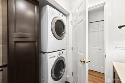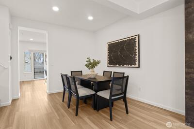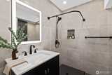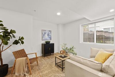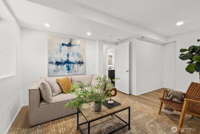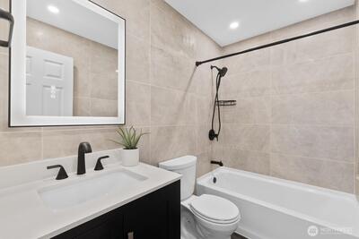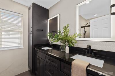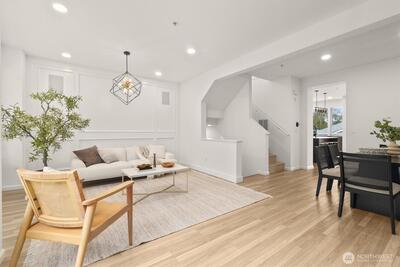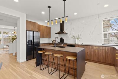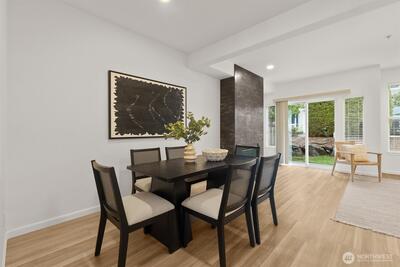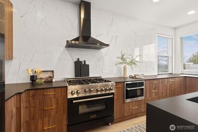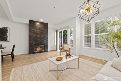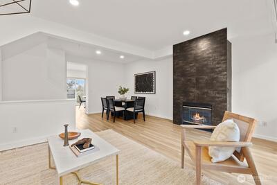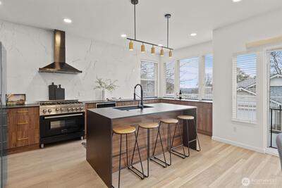 Beautifully reimagined and truly move-in ready, this rare 3-bedroom home in the heart of Bellevue blends modern luxury with everyday convenience just minutes from premier shopping, dining, parks, and major tech campuses. Thoughtfully upgraded with over $130,000 in high-end, minimalist improvements, the home offers a clean, sophisticated aesthetic paired with turnkey ease. The fully remodeled chef’s kitchen serves as the centerpiece, featuring a dramatic waterfall island, luxury countertops, and a 36-inch six-burner designer range, perfect for both entertaining and daily living. Smart home lighting and central A/C provide effortless comfort and control, while fully renovated bathrooms deliver a spa-like experience with premium fixtures and sleek, wall-to-wall tile finishes. The inviting living room is anchored by a striking floor-to-ceiling fireplace feature wall, adding warmth and modern elegance. Upstairs, the primary suite captures captivating views of Downtown Bellevue, bringing t