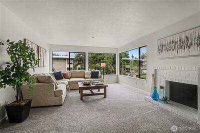 Positioned overlooking Wildwood Park and just moments from downtown Bellevue, this light-filled 2-bedroom, 1.75-bath condo offers the perfect combination of convenience and serene surroundings. Brand new carpet and paint create a fresh, move-in-ready feel, while expansive corner windows fill the home with natural light. A cozy fireplace creates a warm and inviting living room. With the addition of a wet bar and extra storage cabinets adds flexibility for hosting or everyday living, would make a perfect coffee bar! The bright kitchen features white cabinetry, stainless steel appliances, and a pass-through with the sink overlooking the dining area. Step out onto the private covered balcony to take in peaceful park views and lush greenery year-round. The spacious primary suite includes dual closets and a private en-suite bath, while a second bedroom and full bath offer comfort for guests or a home office. Additional amenities include in-unit laundry, secure private parking, extra storage,