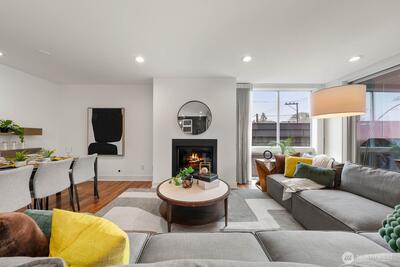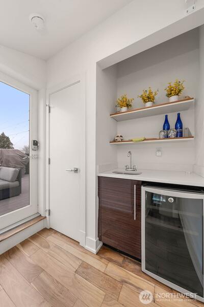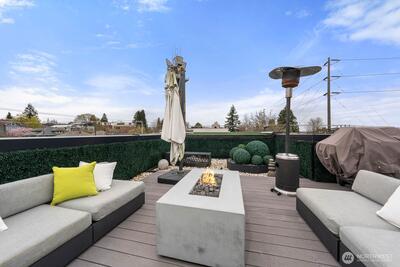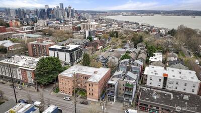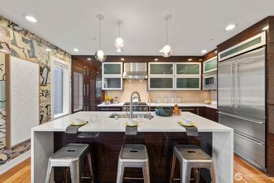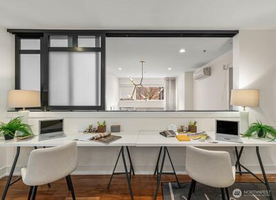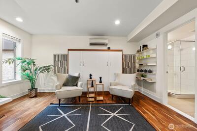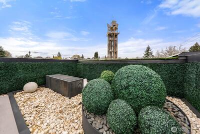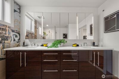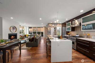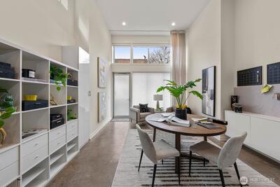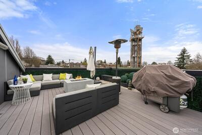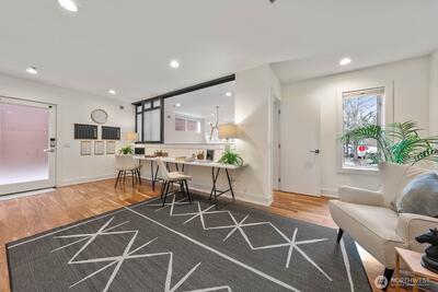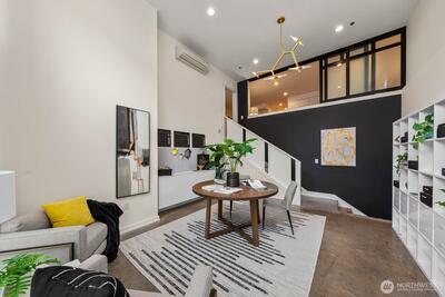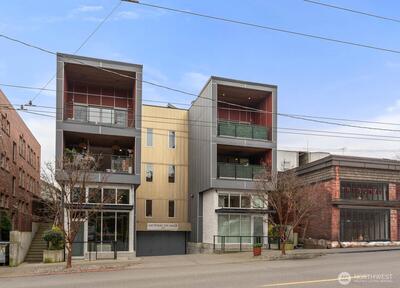 Incredibly rare, phenomenally cool live/work loft in the heart of upper Queen Anne—perfect for those with a vision for an enterprise with zero commute. Exceptional location across from Caffe Vita and next to Via Tribunali, Molly Moon’s Homemade Ice Cream, Un Bien, and Mon Chou with Anytime Fitness just a block away to work it all off and the entire upper Queen Anne strip just beyond. The work loft offers a true streetfront presence (privacy glass optional), with 11’+ ceilings, a small outdoor area, and a bathroom just up the steps. Unprecedented THREE garage parking spaces + storage. Live large across generous, thoughtfully designed spaces—from the entry level with flexible use (including a Murphy bed for guests), to the main living level with an entertainment-sized living/dining/deck, sophisticated kitchen, and Banksy-tiled accent wall, to the bedroom suite with a luxurious walk-in closet. Excellent indoor-outdoor connectivity on every level, culminating in a glorious rooft