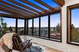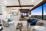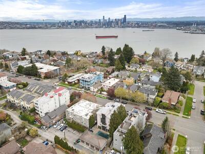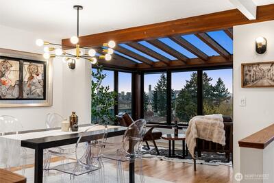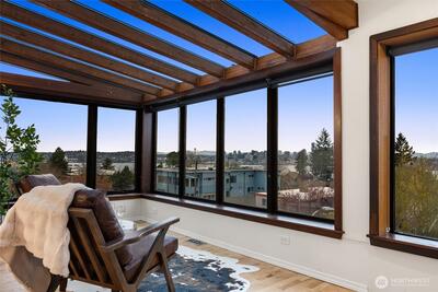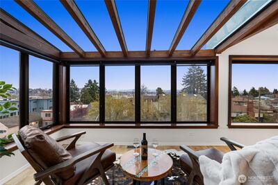 Perched above the city with sweeping views—east to the Seattle skyline, north to Magnolia Bluff, and west to the Puget Sound—this one-of-a-kind residence captures the essence of West Seattle living. Walls of windows, skylights, and a central atrium flood the home with exceptional natural light, while warm wood beams and rich textures create a sense of comfort and understated elegance.Designed for effortless living, this rare single-level home offers elevator access directly from the lobby into the unit. The main living spaces are oriented to maximize the views—perfect for quiet mornings or evenings spent watching the city glow at sunset. A thoughtfully designed kitchen opens seamlessly to the living and dining areas, blending function with style.Private spaces continue the experience, with water and city views extending into the bedroom—creating a peaceful retreat above it all. The lower level offers a generous flex space with wet bar, currently styled as a home office—ideal