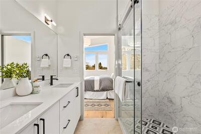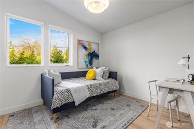 Set on one of Magnolia’s most desirable streets, this DADU by Madrow Homes makes an immediate impression. Soaring 9-foot ceilings, wide-plank oak flooring, and a fluid, thoughtfully designed layout create a sense of ease and intention throughout. At its heart, the kitchen anchors the home as both focal point and gathering space, appointed with custom cabinetry and professional-grade appliances, including Bosch and Fisher Paykal. Living and dining areas extend seamlessly from this central hub, while a nearby bonus room with separate entrance offers versatility for a home office, reading lounge, or private retreat. A main-level powder room adds everyday convenience with a refined touch. Upstairs, two spacious bedrooms offer comfort and privacy. The primary suite blends calm with water views, features a spa-inspired ensuite bath with heated floors and curated finishes that elevate daily routines. A second full bath serves the additional bedroom with equal attention to detail. A dedicate