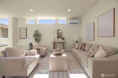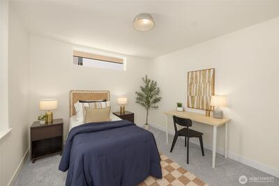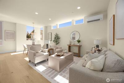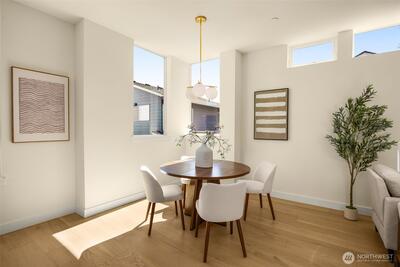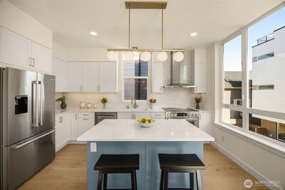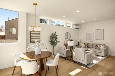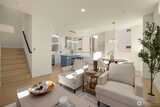 Come home to your light-filled new construction home at Capitol Pines by Blackwood Homes. Offering 3 bedrooms, 1.75 baths, and 1,625 sq ft over a thoughtful square floorplan with beautifully luxe finishes, this one does not live like your typical townhome! The main level is bright and open, awash in southern light through oversized and intentionially placed windows for privacy while letting all of the light in. Warm wood flooring, a Bosch stainless steel appliance package with oversized induction range, large island, custom Abodian cabinetry and an easy flow between the living, dining, and kitchen spaces, all work beautifully for both everyday living and entertaining. One level features two bedrooms, a full bath, and convenient laundry, creating flexible space for guests, work-from-home needs, or additional household living. The top-floor primary suite feels like a private retreat with vaulted shiplap ceilings, excellent natural light, a view of Mt. Rainier on a clear day, a walk-in