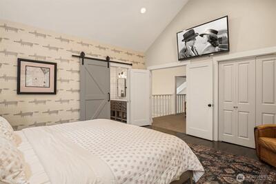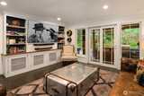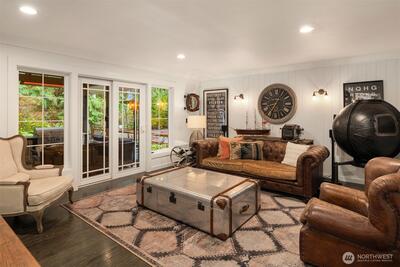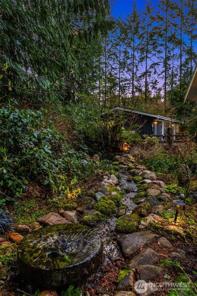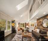 Storybook Living Defined by Architectural Character. Set on over an acre of lush, park-like grounds, this distinctively reimagined Woodinville residence offers a rare blend of privacy, architectural character and elevated indoor-outdoor living. Framed by mature evergreens and a sweeping lawn, the home makes a striking first impression with its metal roof, classic dormers and welcoming covered porch. Inside, soaring vaulted ceilings and expansive skylights fill the great room with natural light, while oversized windows capture serene views of the surrounding landscape. Rich hardwoods, custom millwork and curated finishes create a warm, refined aesthetic throughout. The chef’s kitchen features an oversized quartz island, professional-grade appliances, custom cabinetry and a dedicated espresso and beverage station, flowing seamlessly into the main living and dining areas. A versatile layout includes a private office, multiple living spaces and a luxurious primary suite with a spa-inspir