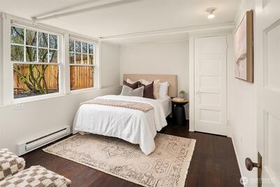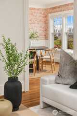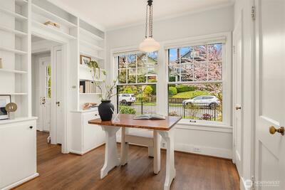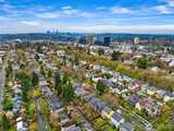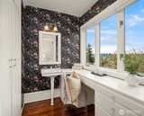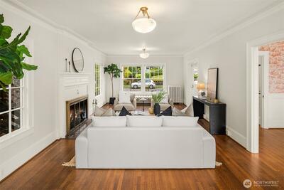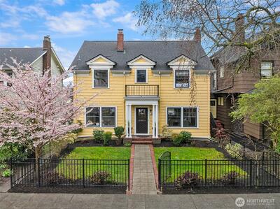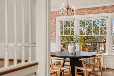 Some homes have soul. This 1917 Colonial just off Ravenna Boulevard has it in abundance. The character announces itself immediately: original oak hardwoods on the main floor, double moulding in the living room, a beautifully wallpapered dining room, and a breakfast table passed from owner to owner since the beginning. Details that simply cannot be replicated. Sweeping Cascade Mountain vistas and unobstructed green space carry across every level, each season bringing its own color and light. Upstairs, four bedrooms including a primary that opens onto its own deck, all on original fir floors aged gracefully over a century. Two of the bedrooms take in the big Cascade views, and a fully updated bathroom serves the floor. The main floor flows in a natural circle from formal entry through sun-drenched living and dining spaces, a kitchen opening onto the deck, and a convenient powder room. Radiant heat keeps every room evenly warm without noise. This home entertains as well as it lives. Step