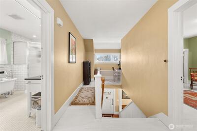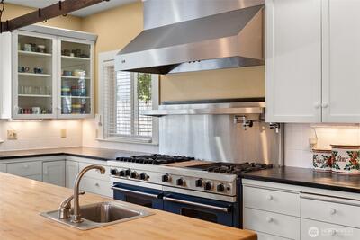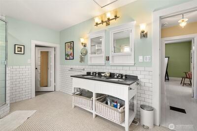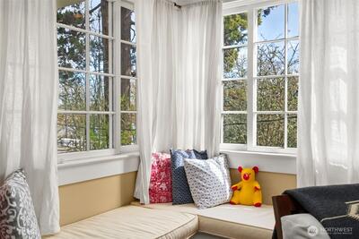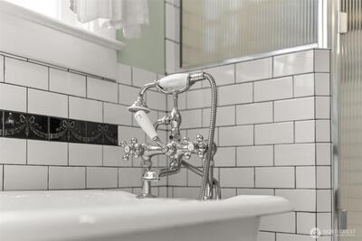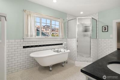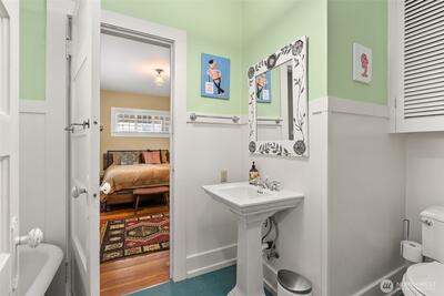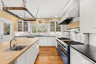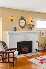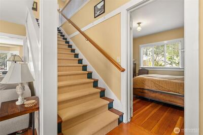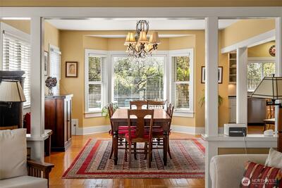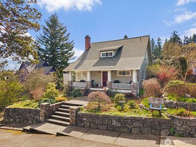 Timeless Craftsman charm meets elevated city living with views of Budd Bay, Mt. Rainier, Capitol dome and downtown Olympia. This thoughtfully designed 2,738 sq ft home blends character and comfort with warm wood flooring, abundant natural light and inviting living spaces throughout, including a living room with a cozy built-in bench and a Danish wood burning stove. The kitchen is a standout with a Viking range, soapstone counters, butcher block island and bright eating area that captures the view. The flexible floor plan includes a main floor bedroom and full bath, while upstairs offers two spacious suites, each with its own beautifully appointed bath featuring tile finishes, a clawfoot tub and classic details. A partially finished basement adds additional space for an office, hobbies or storage. Enjoy outdoor living on the deck or patio surrounded by mature landscaping, all set above the city for a truly special perspective. Just over a century old, this home reflects a level of craft