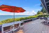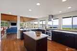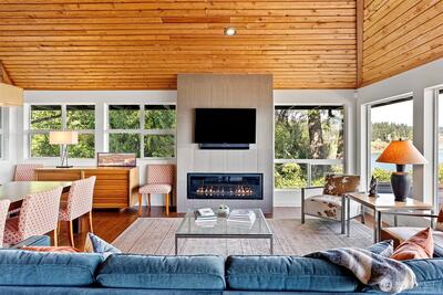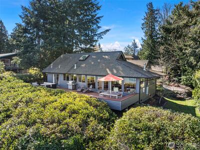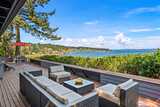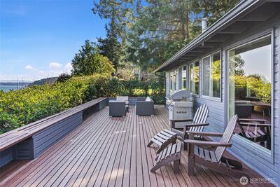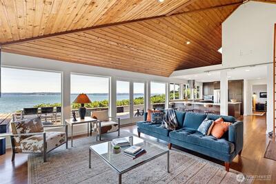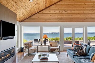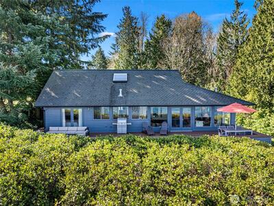 This quintessential Northwest Contemporary delivers the waterfront lifestyle you've been looking for - with sweeping 180-degree views of Tramp Harbor, KVI Beach, the East Passage, SeaTac and the Cascades stretching across the horizon. Two separate tax parcels totaling 2/3 of an acre offer 150 feet of water frontage and a wonderful sense of privacy and seclusion. A step-less, covered entry opens to a breathtaking main living space with 18-foot vaulted cedar-planked ceilings, rich hardwood floors and walls of glass framing the view from every angle. A natural gas fireplace anchors the room with French doors opening to an expansive 1,100 SF view deck - ideal for entertaining large groups. The gourmet kitchen is thoughtfully appointed with quartz counters, stainless appliances, pantry storage and custom cabinetry with pull-out shelving. The primary suite is a true retreat, featuring a spacious walk-in closet, a bath with glass-enclosed shower and deck access. A second full bath with tub/sh
