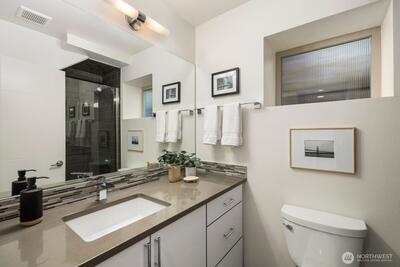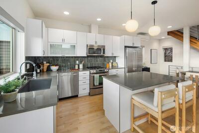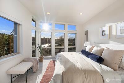 Not all modern homes are created equal, and this one proves it. This stand-alone 3-bedroom home is perched to capture unobstructed views of Salmon Bay & Shilshole, and stands apart with something rarely found in newer construction: both gorgeous scenery and a truly usable yard. Floor-to-ceiling windows with southwestern exposure flood the home with natural light while framing stunning water and mountain views from nearly every level. Enjoy golden hour from the living room, unwind in the primary suite, or take it all in from the rooftop deck, complete with a wet bar for effortless entertaining and 360-degree views that never get old. The flexible layout offers space to live, work, and host with ease. The primary suite is a true retreat with sweeping views, a large walk-in closet, and a spa-like 5-piece bath. Outside, the large yard delivers what most vertical homes cannot. A deck for dining, garden beds, storage shed, and plenty of space for a dog to run. Off-street parkin