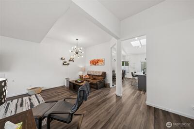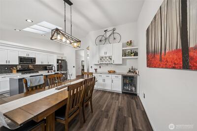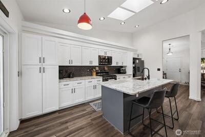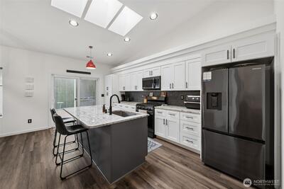 Adorable Puyallup Valley rambler in the desirable SummerView Estates community, located within the sought-after Sumner School District and featuring private trail access to the Puyallup River! This beautifully remodeled home offers an open-concept floor plan with soaring vaulted ceilings and timeless finishes throughout. The spacious living room with a cozy gas log fireplace flows seamlessly into the light-filled kitchen and dining area. The stunning kitchen was fully updated in 2022 with new quartz countertops, white cabinetry, SS appliances, LVP flooring, and a center island with breakfast nookâperfect for everyday living and entertaining + a wet bar off the dining area! The inviting primary suite features a walk-in closet with California Closets and a private ensuite bath with double sinks. 2 additional guest bedrooms and bath! Additional updates include new interior paint (2022) and a brand-new 30-year roof installed in October 2025, offering peace of mind for years to come. Step