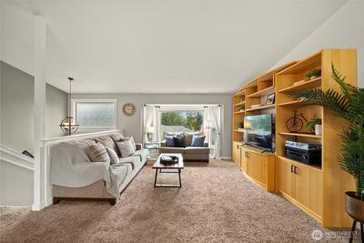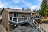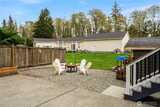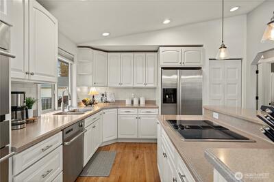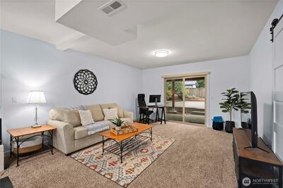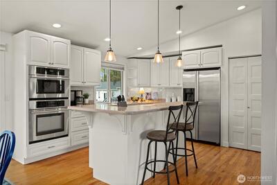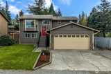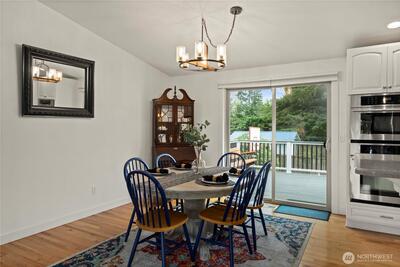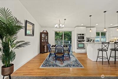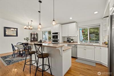 Open, bright, and thoughtfully laid out, this Maple Valley home offers comfortable living spaces and easy indoor-outdoor flow. The main living area features vaulted ceilings and a large bay window that fills the space with natural light. The kitchen showcases solid oak hardwood floors, white cabinetry, stainless steel appliances, wall oven, durable solid surface counters, a pantry, and a generous center island with seating. The adjacent dining area opens to a large deck, creating a natural extension of the living space for gatherings and outdoor enjoyment. The primary bedroom is light-filled and inviting, complete with its own slider opening directly to the patio. Downstairs, a spacious bonus room with fireplace and sliding glass door leads to a fully covered patio with a built-in gutter system, allowing for comfortable outdoor use throughout the seasons. Two additional bedrooms are located on the lower level along with a full and half bath, offering flexibility for guests, work-from-h