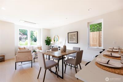 Welcome to this community of three newly built modern homes in Seattle’s vibrant Central Area, crafted by Bungalow Building. Thoughtfully designed with contemporary living in mind, each home features an open-concept floor plan, premium finishes, and dedicated off-street EV-capable parking. This three-story, 1,651 sq ft residence offers a bright and inviting main level with a spacious living and dining area, a chef’s kitchen with ample custom Bellmont cabinetry, quartz countertops, stainless steel appliances/induction range, powder bath, and a convenient mudroom off the kitchen with an additional exterior door. Upstairs, the second level includes two well-appointed bedrooms, a full bathroom, and a laundry closet for added convenience. The top floor is a true retreat, featuring a luxurious primary suite with a spa-inspired bath, huge walk-in closet system, vaulted ceilings, and a versatile flex space—perfect for a home office, nursery, or reading lounge. High-end details throughout