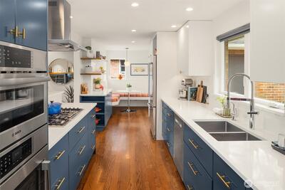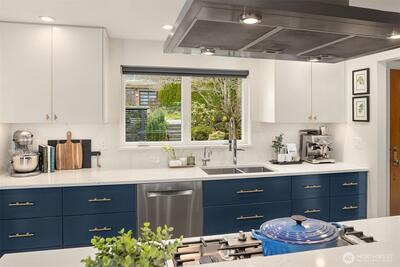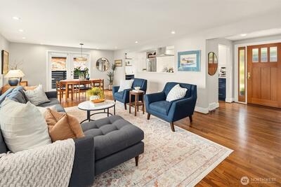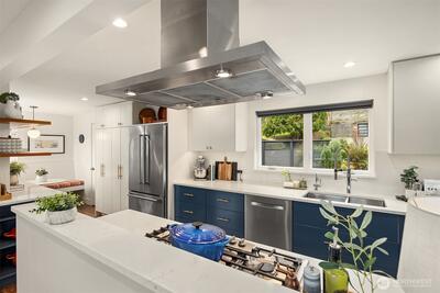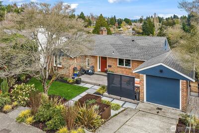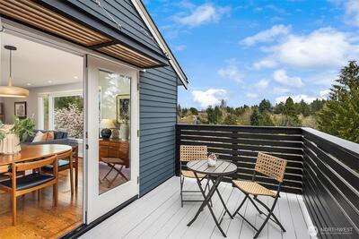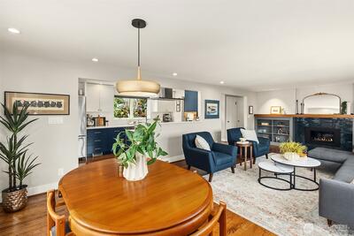 Inviting, updated, and ideally located—this delightful home blends comfort, style, and convenience in Laurelhurst. Professionally designed and landscaped, the front yard offers standout curb appeal with milled steel planters, seasonal color, and a private deck perfectly positioned for sunny southwest exposure and al fresco dining. Inside, light-filled living and dining spaces showcase a large window framing peaceful territorial views capturing seasonal colors. A cozy gas fireplace and French doors to a new deck create effortless indoor-outdoor flow. The remodeled kitchen shines with custom cabinetry, gas cooktop, double wall speed oven, and a built-in banquette—perfect for everyday living and entertaining. The main level features a spacious primary bedroom with dual closets and lovely outlooks, plus a second bedroom and full bath. Downstairs, a generous family room with gas fireplace opens to the backyard, second deck, and patio with evergreen views over neighboring Windermere. A n