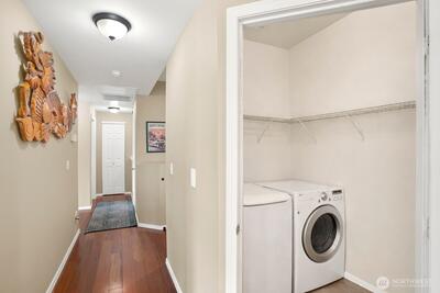 Step into this beautifully bright and inviting 2-bedroom, 2-bath townhouse offering 1,140 sq ft of effortless, low-maintenance living. The open-concept layout is filled with natural light and enhanced by sleek laminate wood-style flooring and soaring ceilings, creating an airy, modern feel throughout. Cozy up by the fireplace or step outside to your private balcony - perfect for morning coffee or unwinding at the end of the day.The spacious primary suite is a true retreat, featuring a walk-in closet, additional linen storage, and a private bath. A well-positioned second bedroom and full bath provide flexibility for guests, a home office, or both. The thoughtfully designed laundry room doubles as a pantry, adding extra convenience and storage.Enjoy peace of mind with a recently installed new roof and the ease of carpet-free living. Parking is a breeze with a private 1-car garage plus additional driveway space. Ideally located near the Interurban Trail, I-5, Sounder Train stations, local