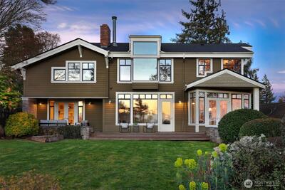 A welcoming approach through lush, mature gardens and meandering paths sets the tone for this exceptional property, offering a sense of privacy and calm from the moment you arrive. Set on an expansive 20,800 sq ft lot, the grounds live like a private retreat, with spaces to wander, gather, and take in sweeping views of the Olympic Mountains and Puget Sound. An oversized two-car garage adds everyday ease. Inside, the 4,860 sq ft home unfolds with warmth and architectural character. Rich maple cabinetry, distressed concrete and mahogany floors, and thoughtfully designed lines create depth, texture, and a grounded, inviting aesthetic. With five bedrooms which includes a spacious primary suite, four baths, and multiple bonus and media spaces, the layout offers flexibility for living, working, and entertaining. Throughout, intentional details like window seats, lofted spaces, and tucked away nooks create moments of discovery and connection, echoing the home’s unique design. At the heart o