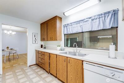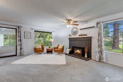Welcome home to this lovely rambler in the highly desirable 55+ Vista Village community, where comfort, convenience, and peaceful living come together! Tucked in a beautifully maintained neighborhood known for its mature landscaping, tranquil setting, and frequent visits from local deer, this charming 2-bedroom home offers easy single-level living close to shopping, dining, medical services, parks, and everyday amenities in the heart of Lacey.Inside, you’ll find a nicely maintained floor plan with a spacious central living area featuring large picture windows and a cozy propane fireplace. The bright sunroom is a true highlight—complete with skylights and a solar tube—creating the perfect space to relax and enjoy garden views year-round. A covered back patio adds even more room to unwind outdoors. Recent updates include newer interior paint and carpet, newer bathroom vanities, newer kitchen stove, newer roof, new attic insulation, and a newer electrical panel. The convenient 1-car